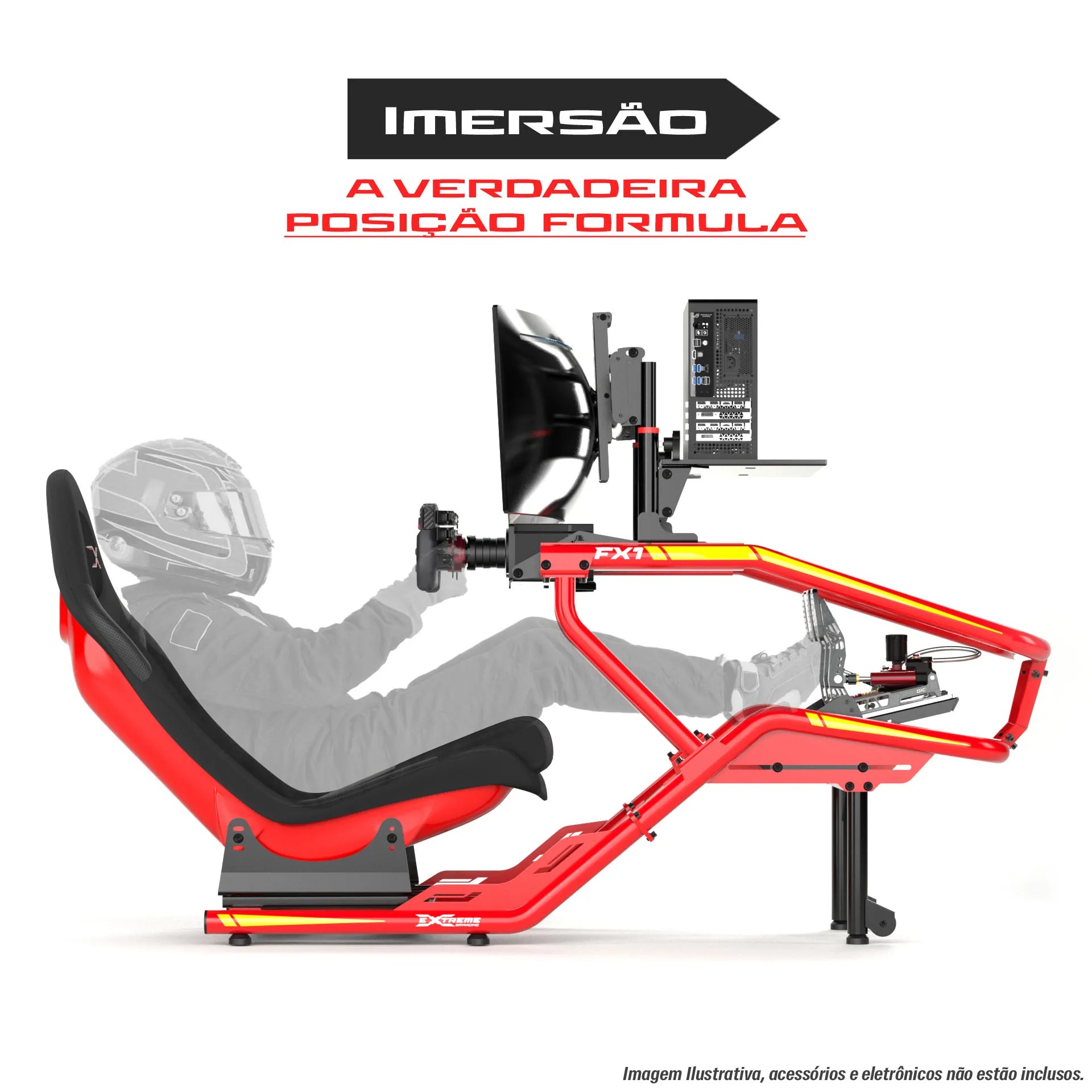 Simulador de alta performance, inspirado na posição de pilotagem de Fórmula 1, desenvolvido com estrutura reforçada para oferecer máximo realismo, estabilidade e durabilidade.